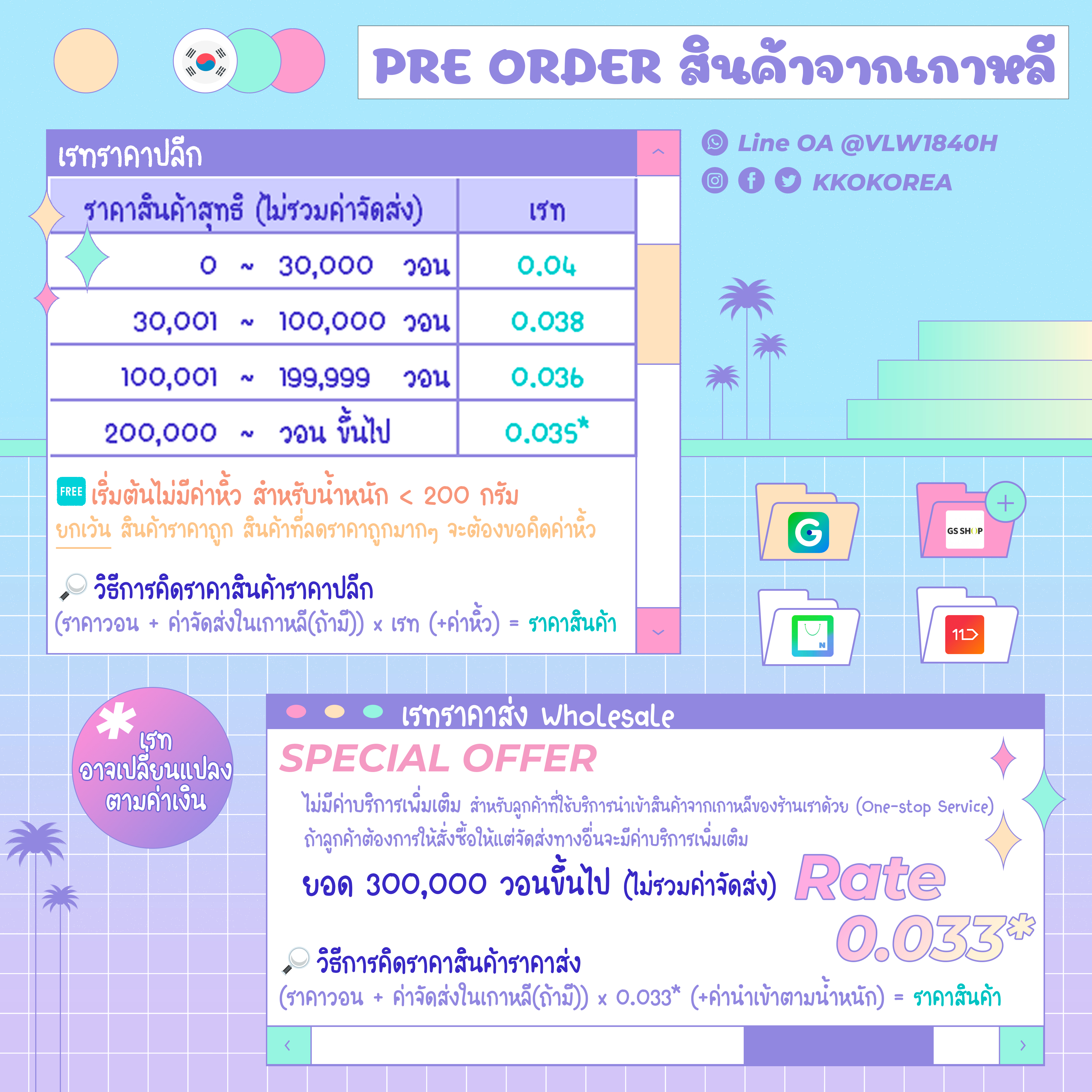- บางร้านจะส่งฟรีตั้งแต่ชิ้นแรก บางร้านจะมีค่าส่งในประเทศเกาหลี ราคา 2,500 วอน ต่อการสั่ง 1 ครั้ง