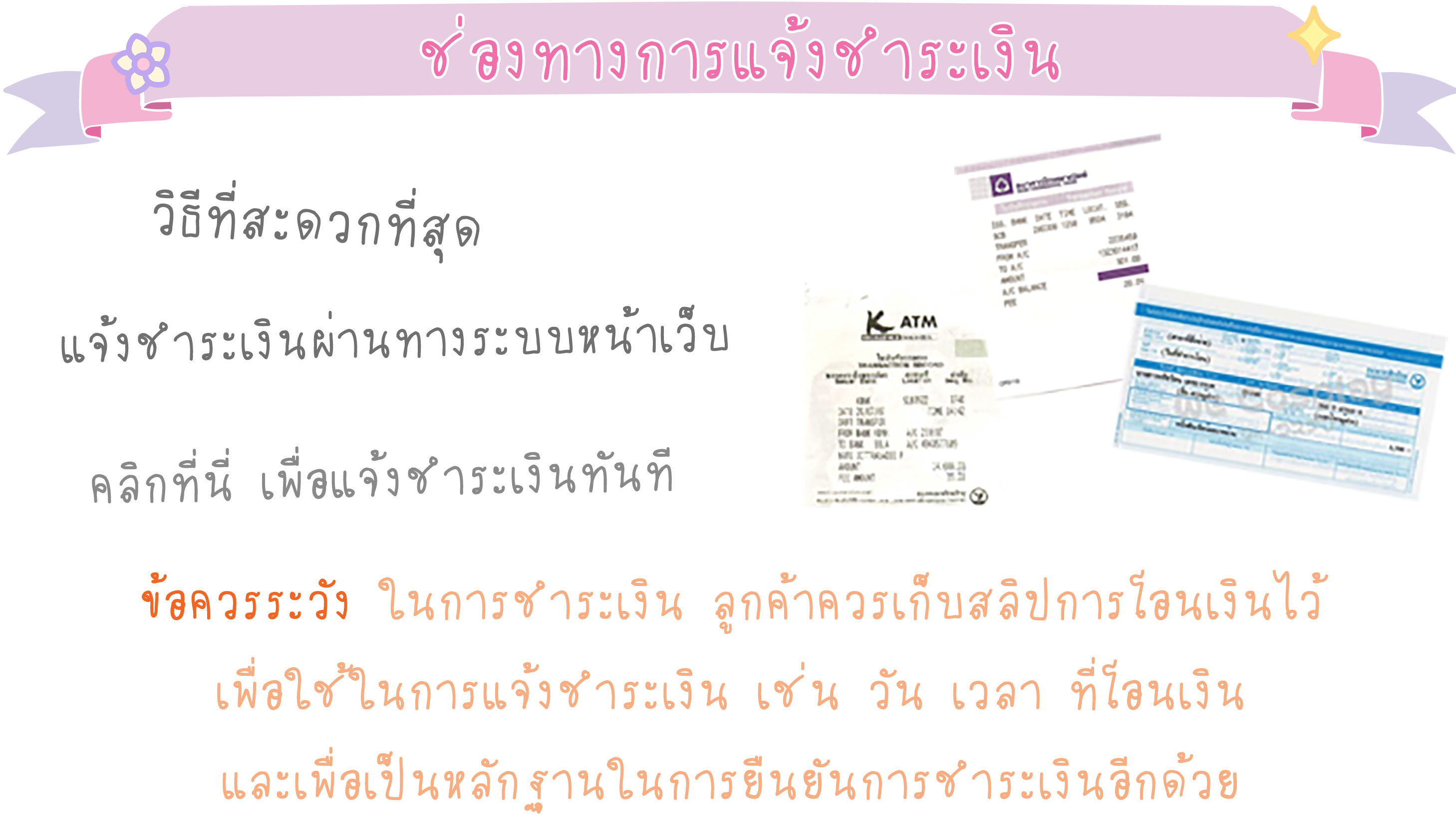 *กรุณาแนบไฟล์ภาพสลิปการโอนเงินของท่านมาด้วย หากไม่สามารถแนบได้ ท่านต้องระบุเวลาที่โอนเงินให้ถูกต้อง